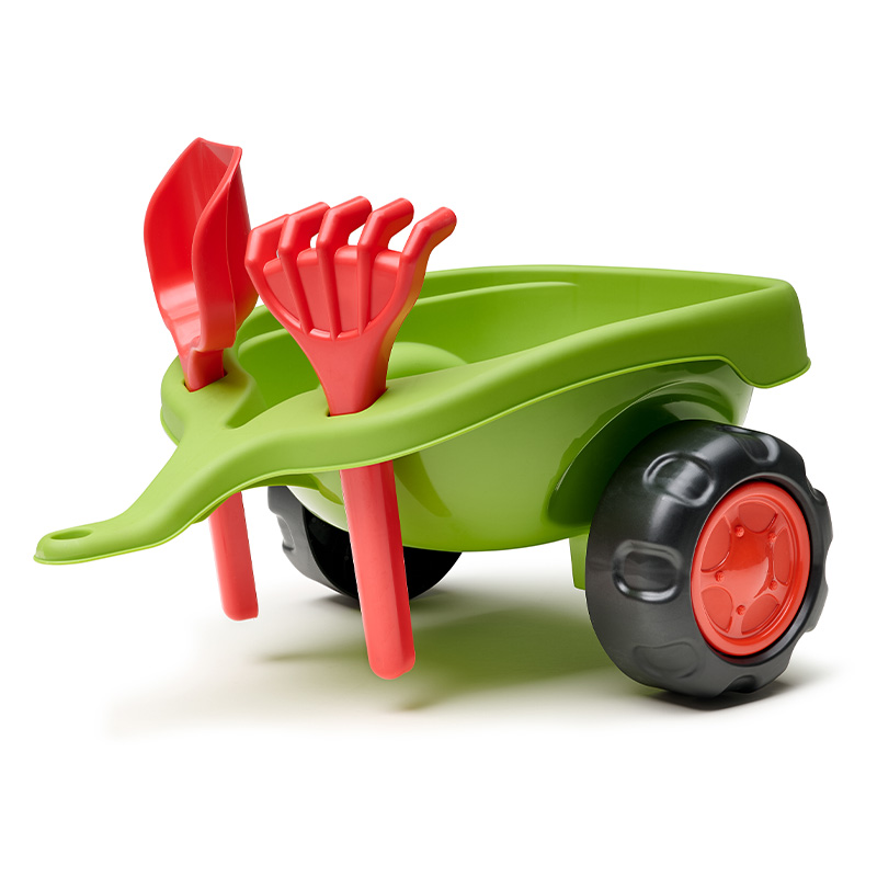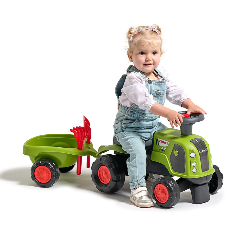 BabyClaas ride-on tractor with steering wheel, horn with trailer, rake & shovel