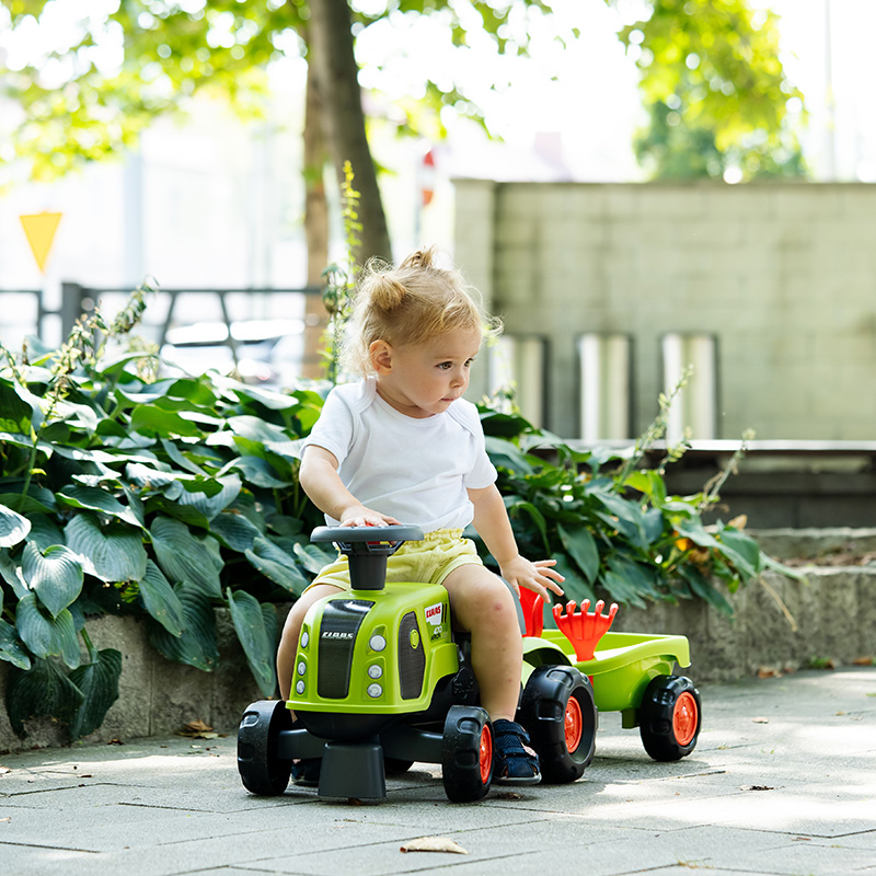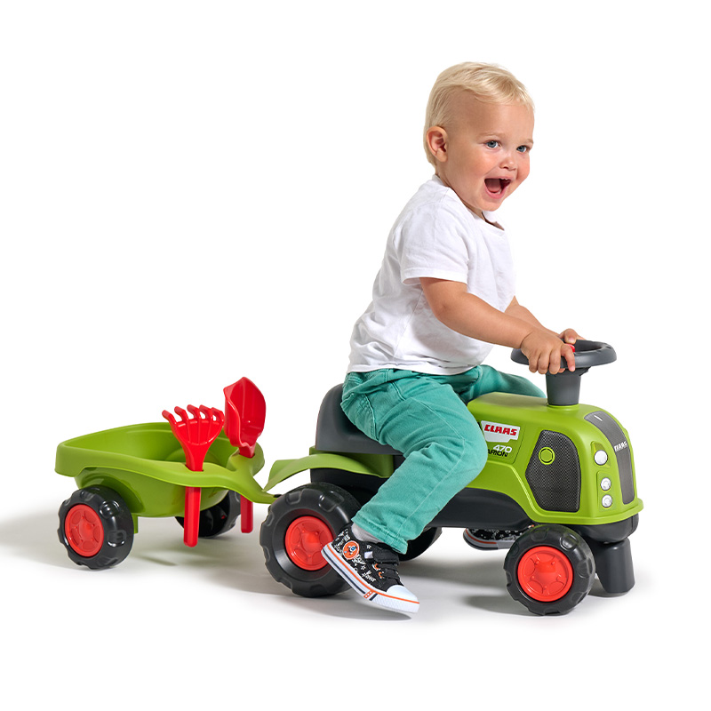 BabyClaas ride-on tractor with steering wheel, horn with trailer, rake & shovel – 100% Made in France – Contains 90% recycled plastic – From 12 months.