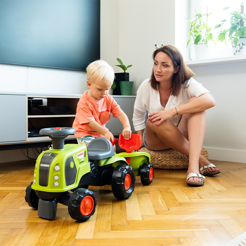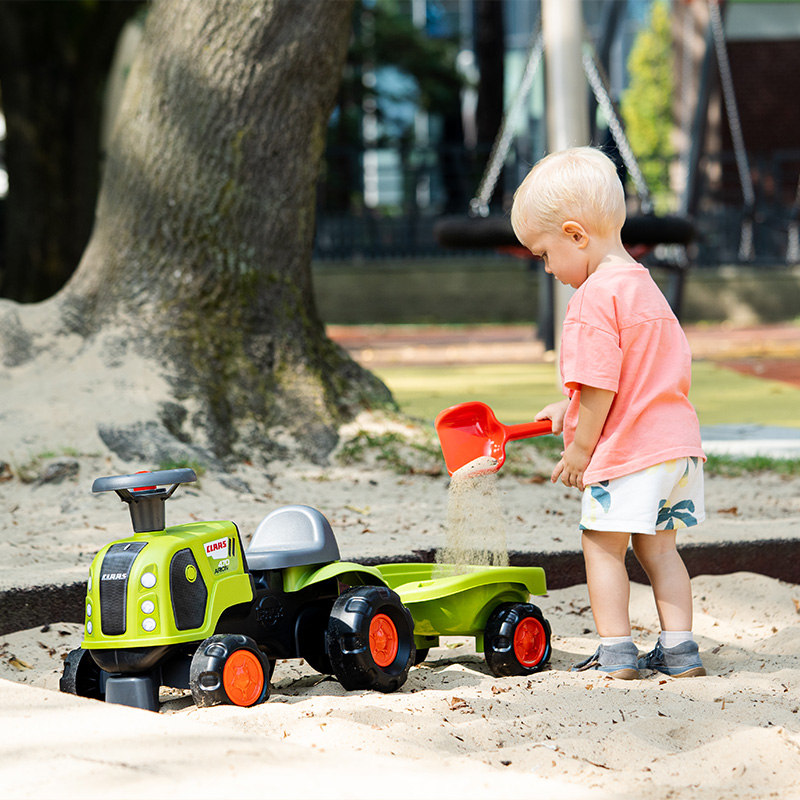 A cute little Claas tractor full of tricks to accompany your child from 12 months. It’s equipped with a directional steering wheel and horn to develop fine and gross motor skills, while having fun getting from one end of the house or garden to the other. It comes with a trailer, shovel and rake for even more playability.