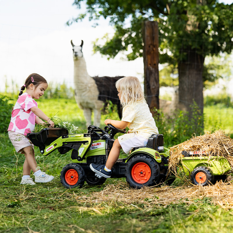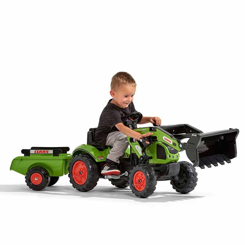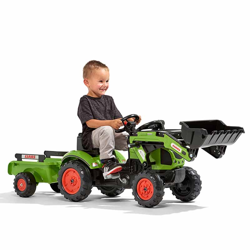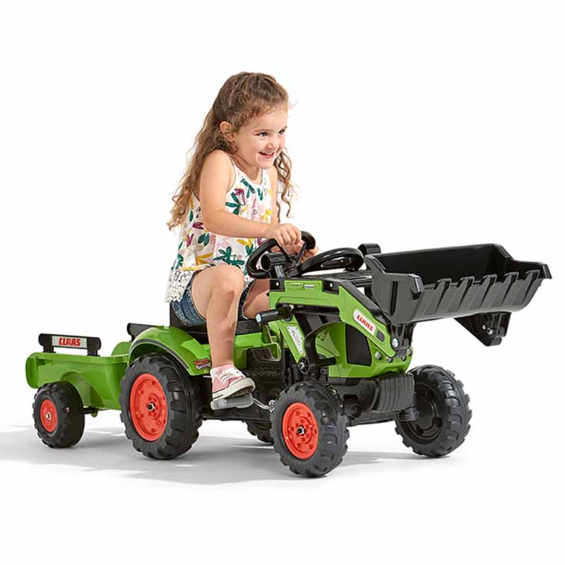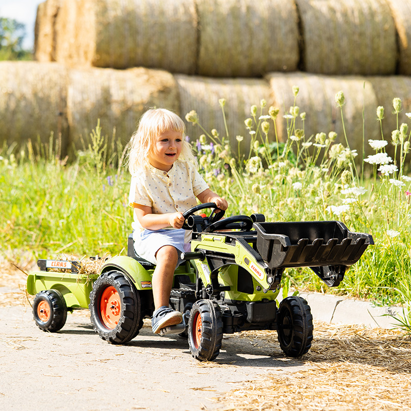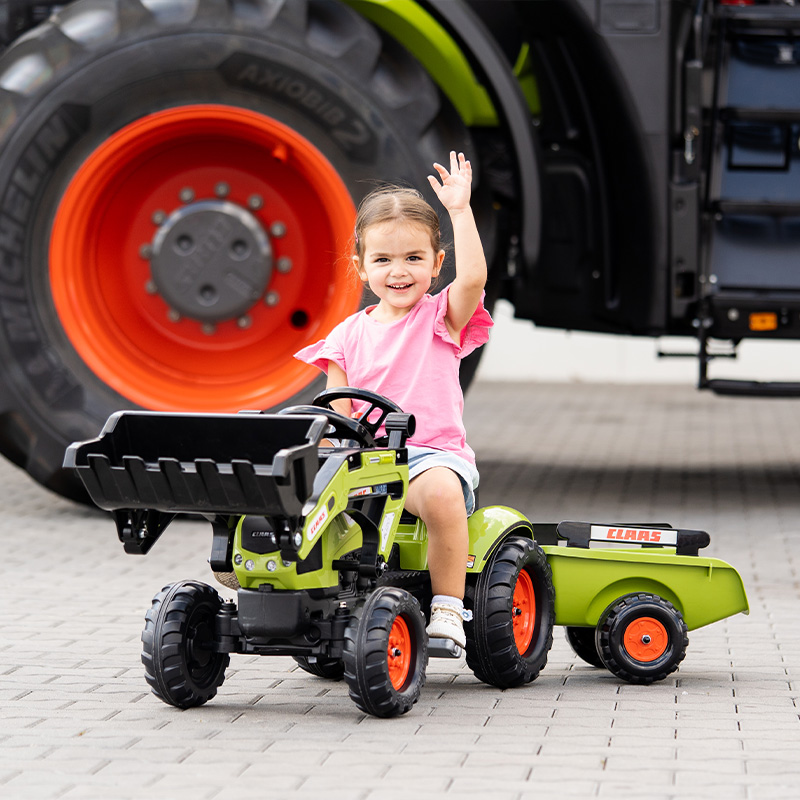Claas backhoe, true pedal replica of the Arion 410 model, equipped with a directional steering wheel with horn and trailer – 100% Made in France – Contains at least 70% recycled plastic – From 2 years.