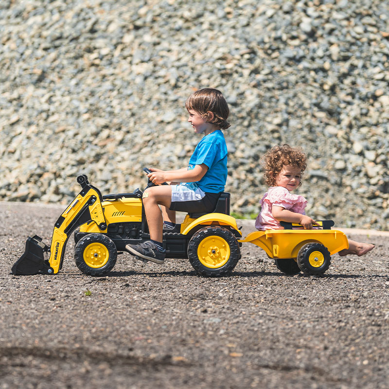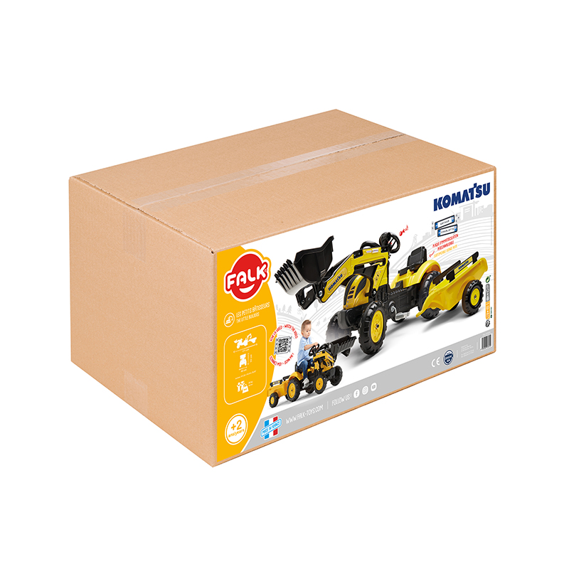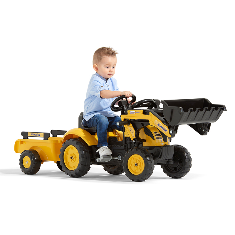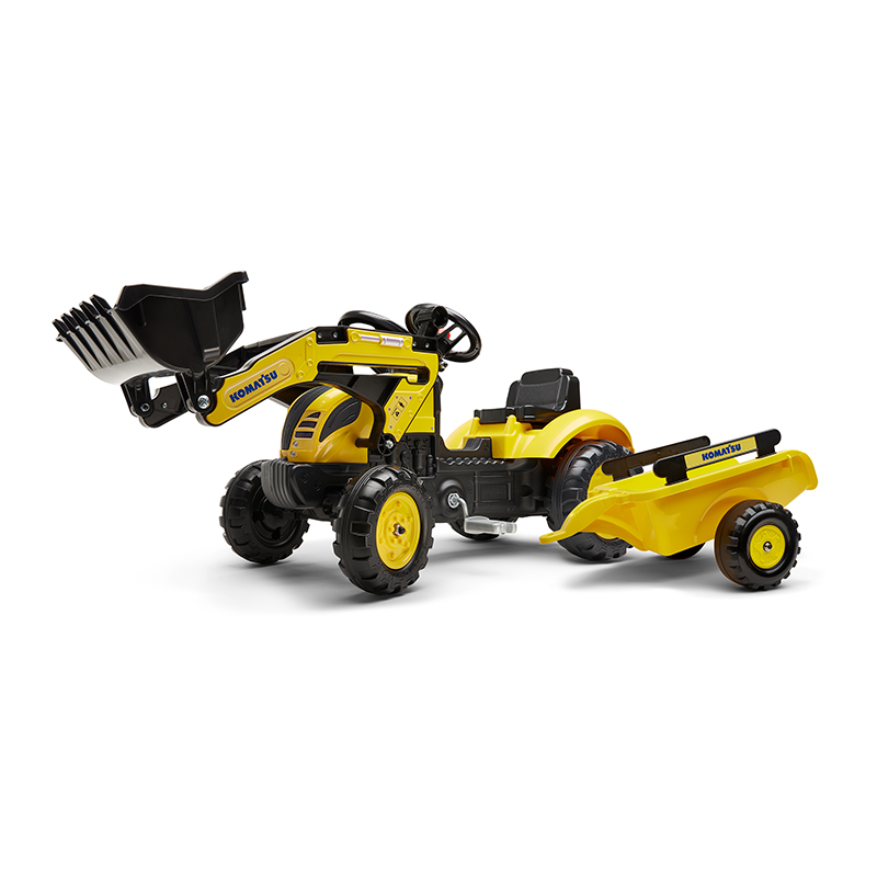 Komatsu pedal backhoe with fully articulated front shovel and trailer included – 100% Made in France – Contains 40% recycled plastic – From 2 years.