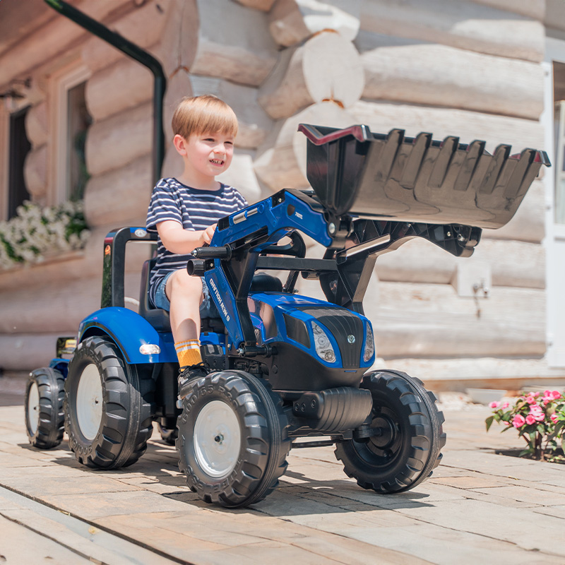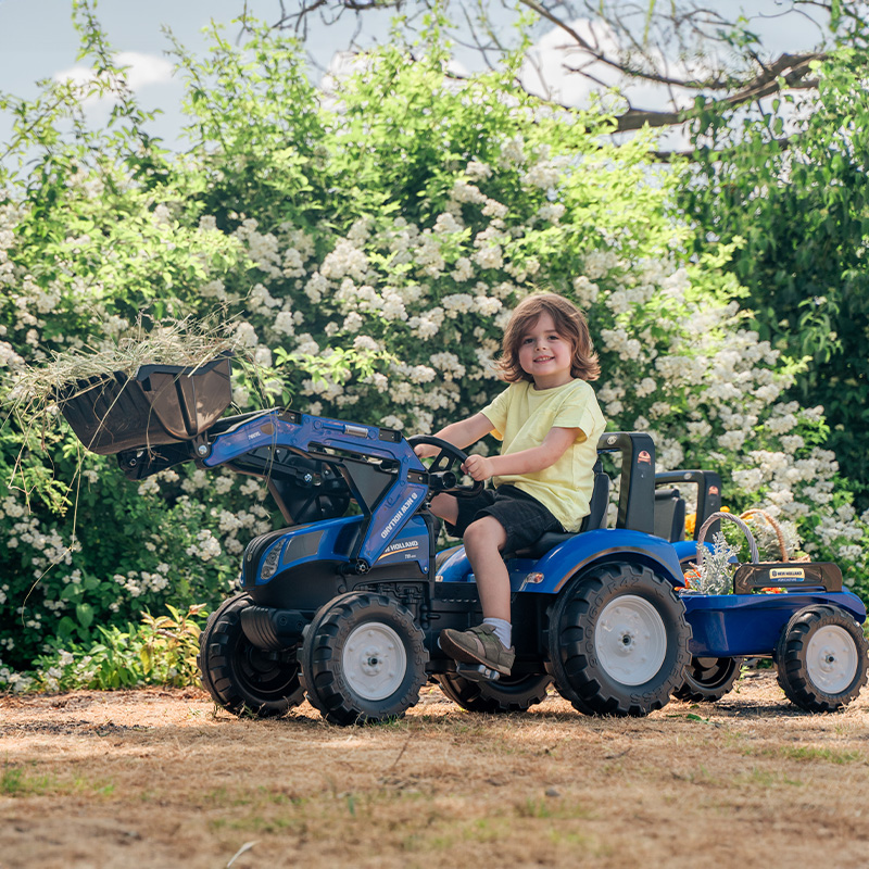 This New Holland backhoe especially designed for little adventurers from 3 to 7 years old is a faithful pedal replica of the T8 model. Its articulated front loader allows your child to move around sand, soil or leaves. For even more play opportunities, it is equipped with a large volume trailer with side panels. As both gardener and farmer, your child will develop autonomy and imagination. This handy 100% made in France backhoe with a steering wheel with horn guarantees hours of outdoor play activities!