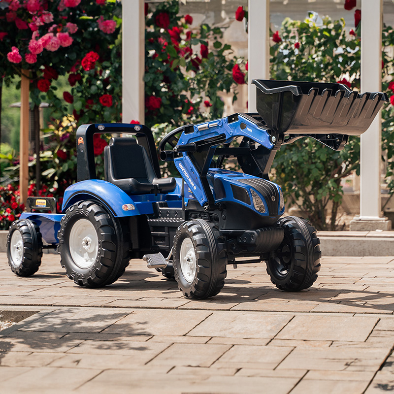 New Holland Blue backoe with front loader, trailer and steering wheel. A faithful replica of the T8 model – 100% made in France for little adventurers from 3 to 7 years old.