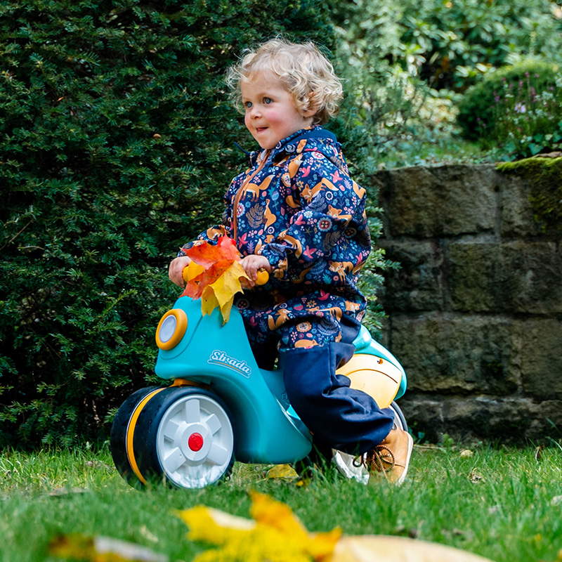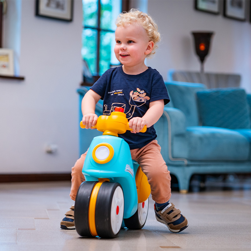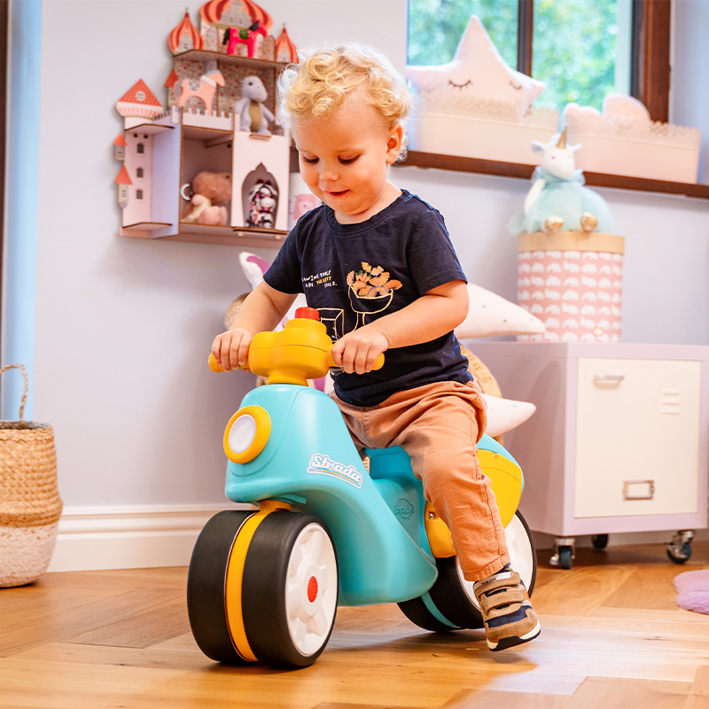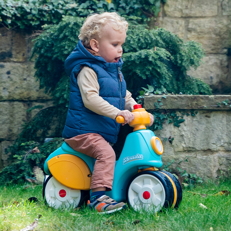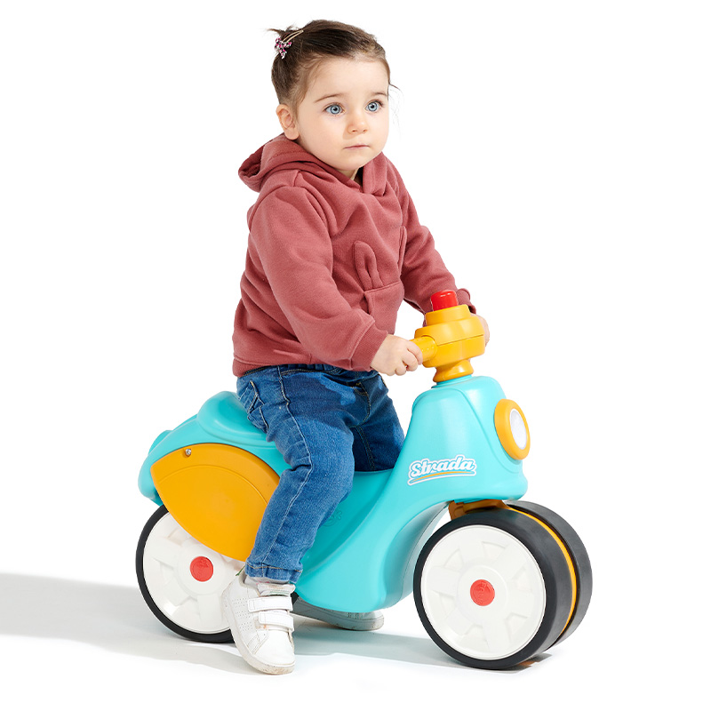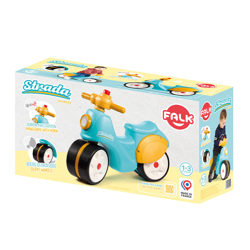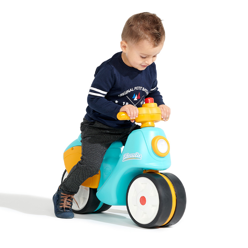 “Strada” is driven like a real scooter thanks to its directional handlebar which keeps its small manual horn which amused our children so much and will certainly amuse yours tomorrow!