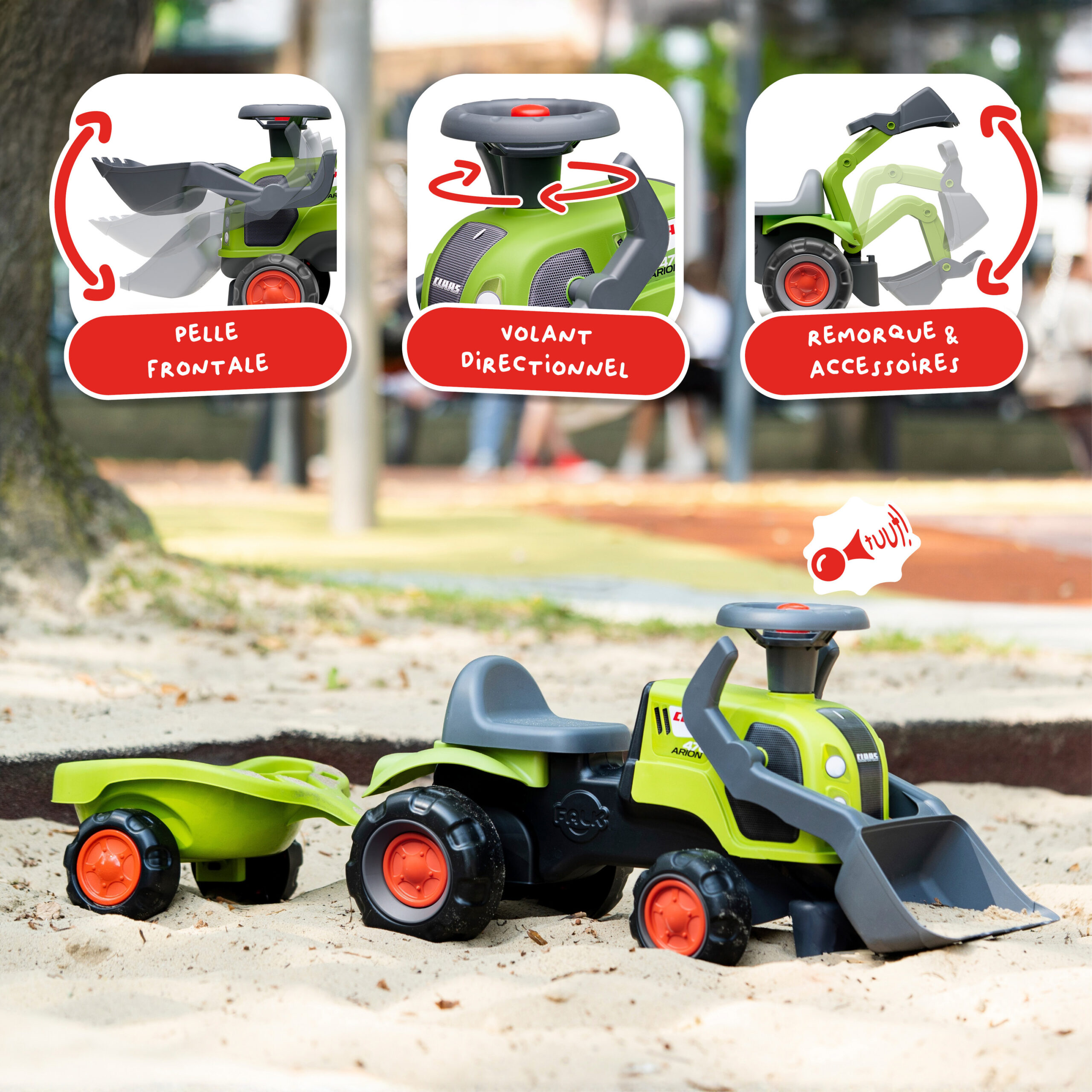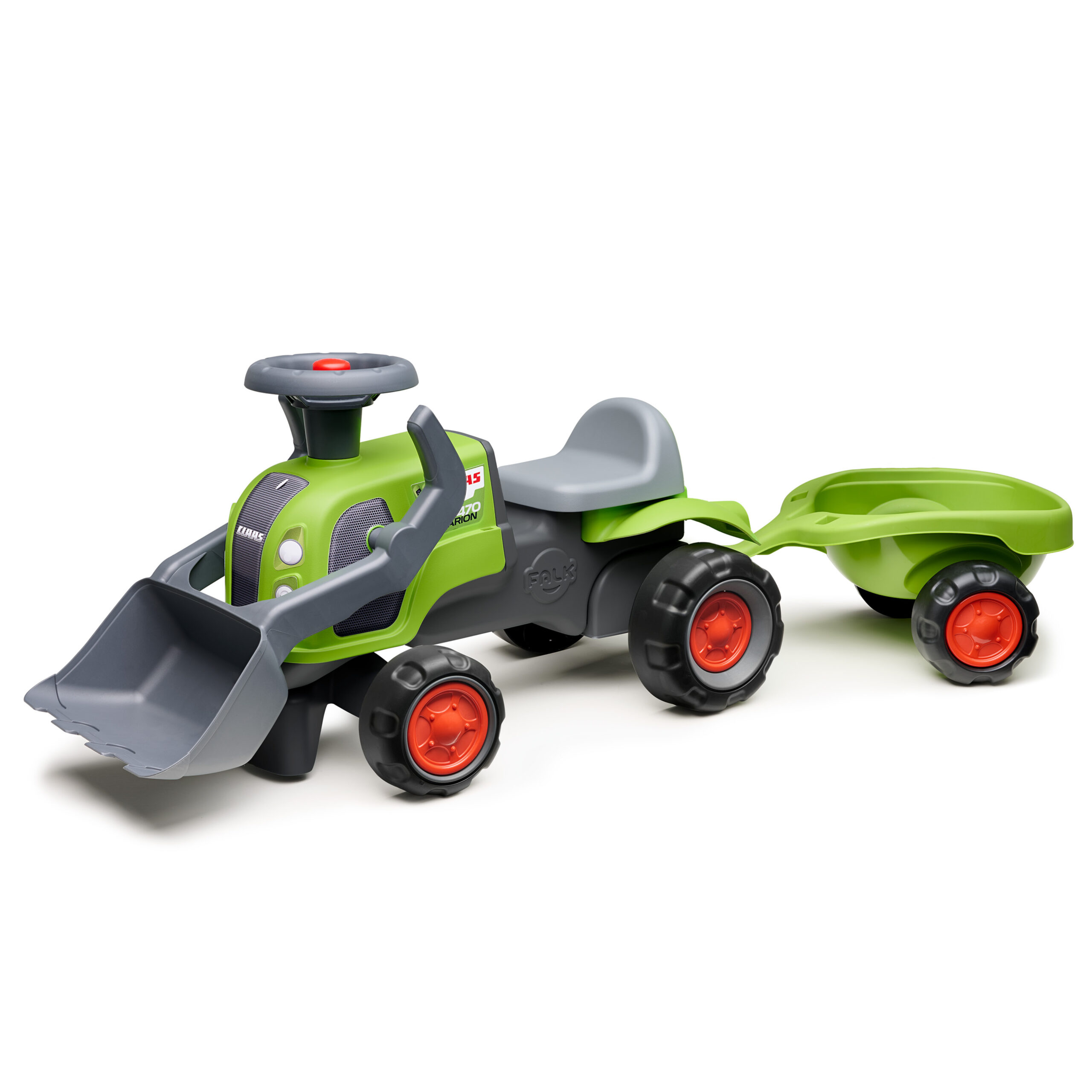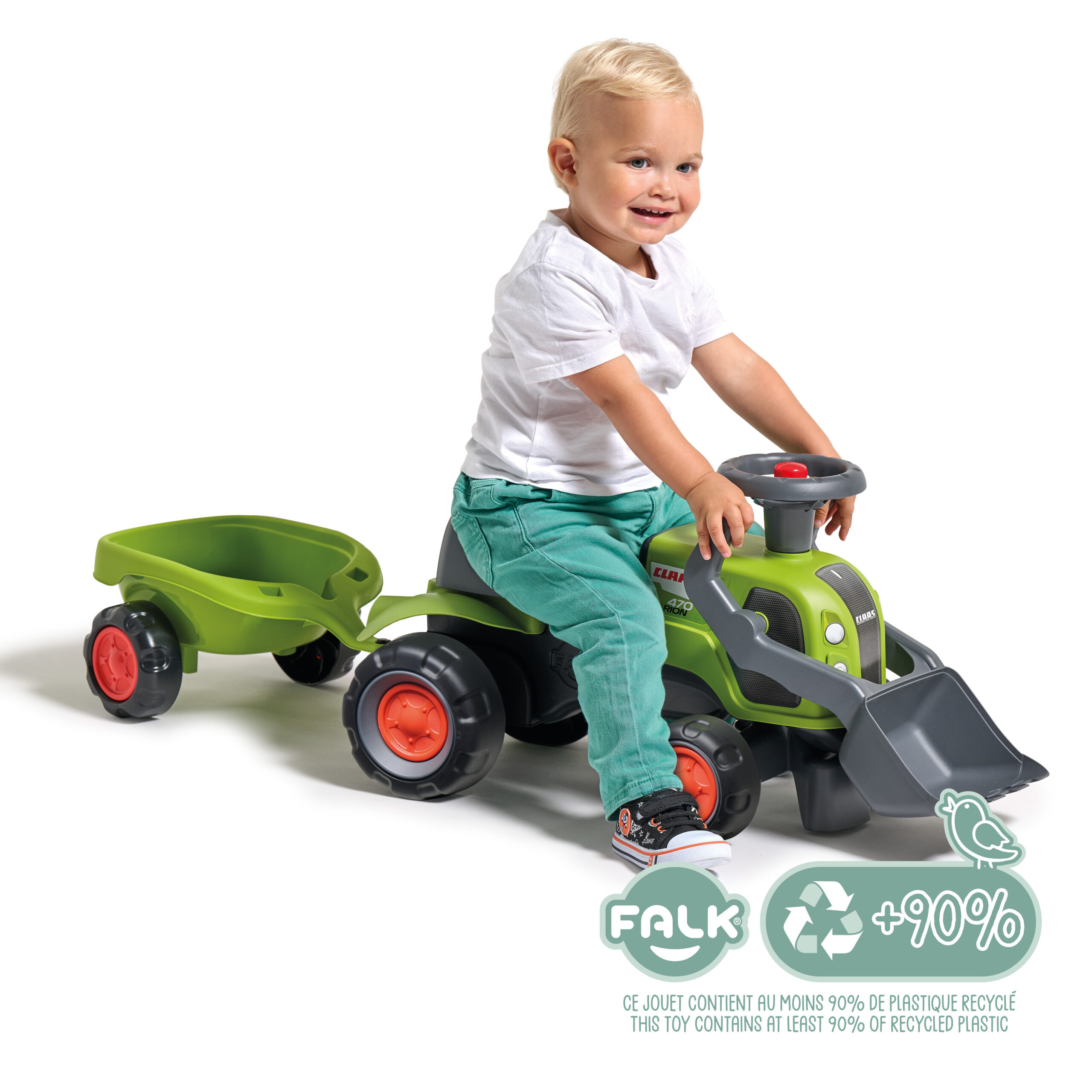 Porteur tracteur Claas 1er âge à volant directionnel avec klaxon, roues silencieuses, pelle frontale et remorque – 100% Fabriqué en France – Composé d’au moins 90% de plastique recyclé – Dès 12 mois.