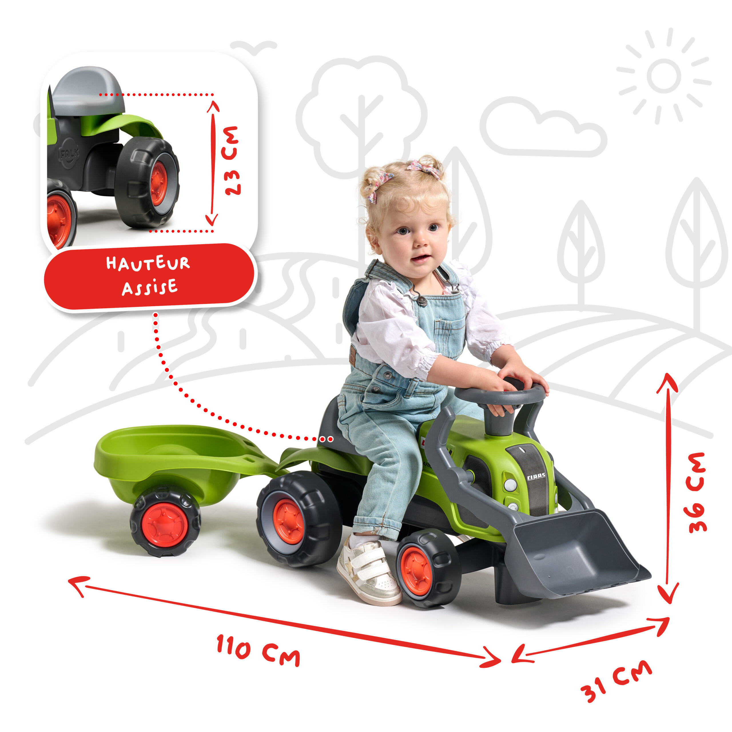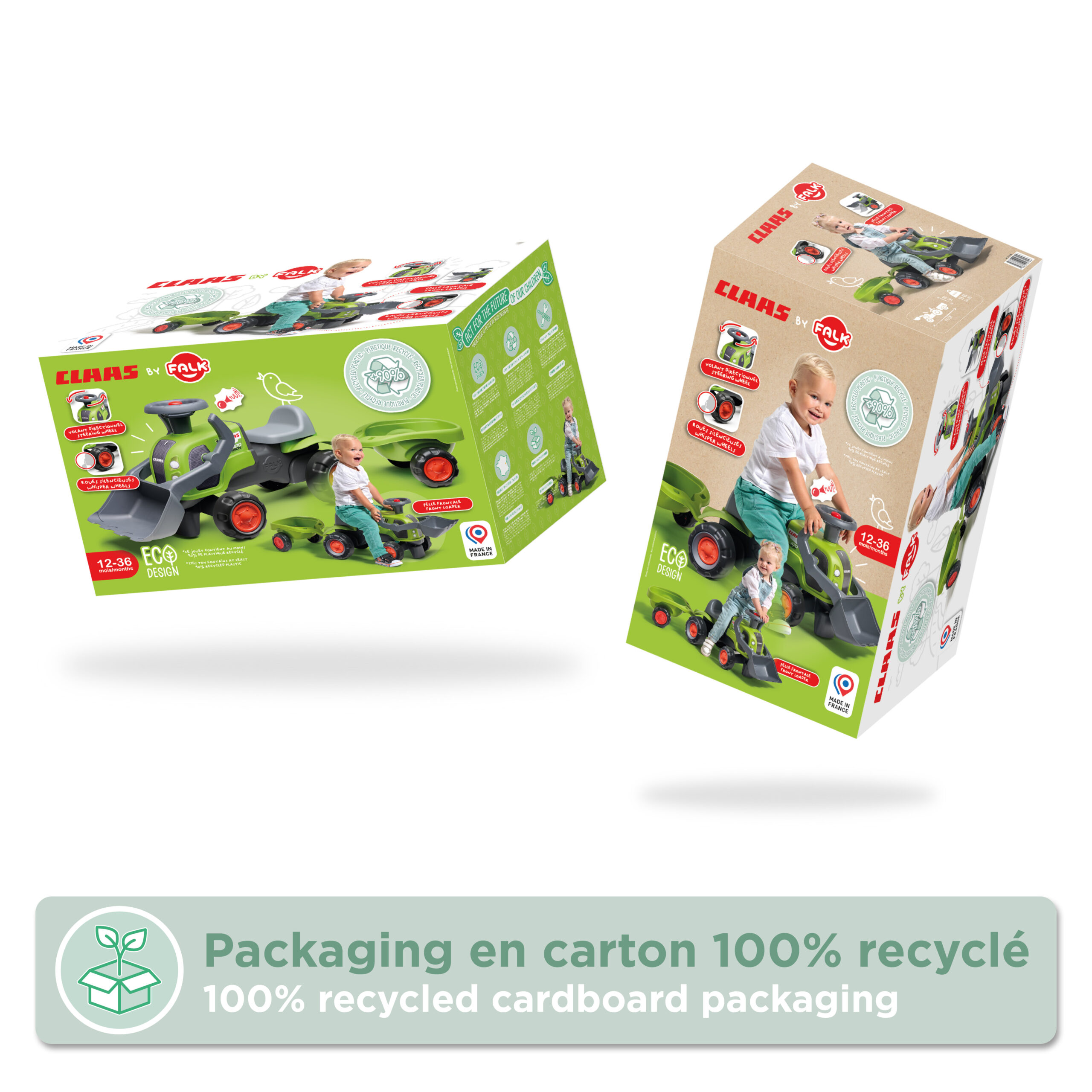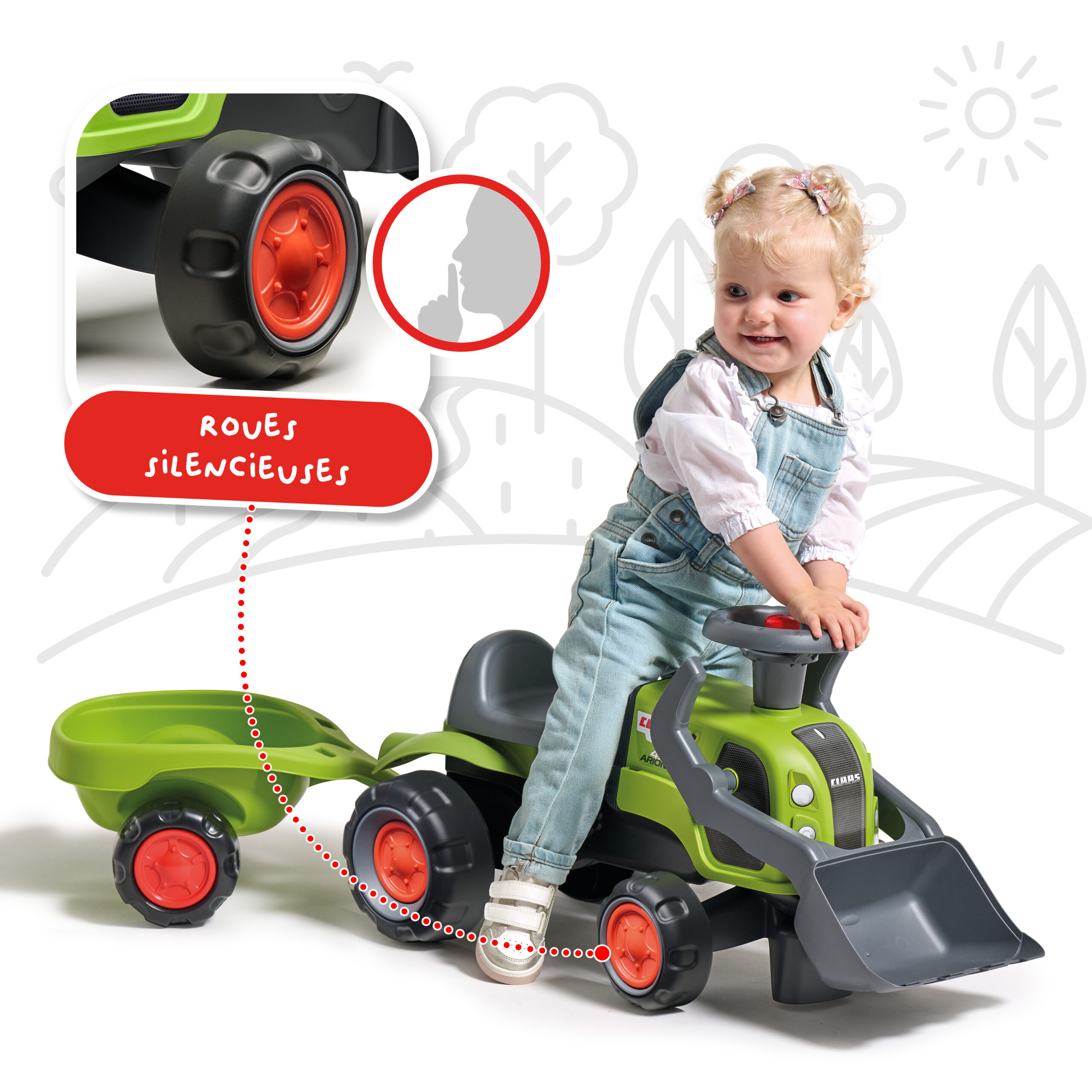 Porteur tracteur Claas 1er âge à volant directionnel avec klaxon, roues silencieuses, pelle frontale et remorque – 100% Fabriqué en France – Composé d’au moins 90% de plastique recyclé – Dès 12 mois.