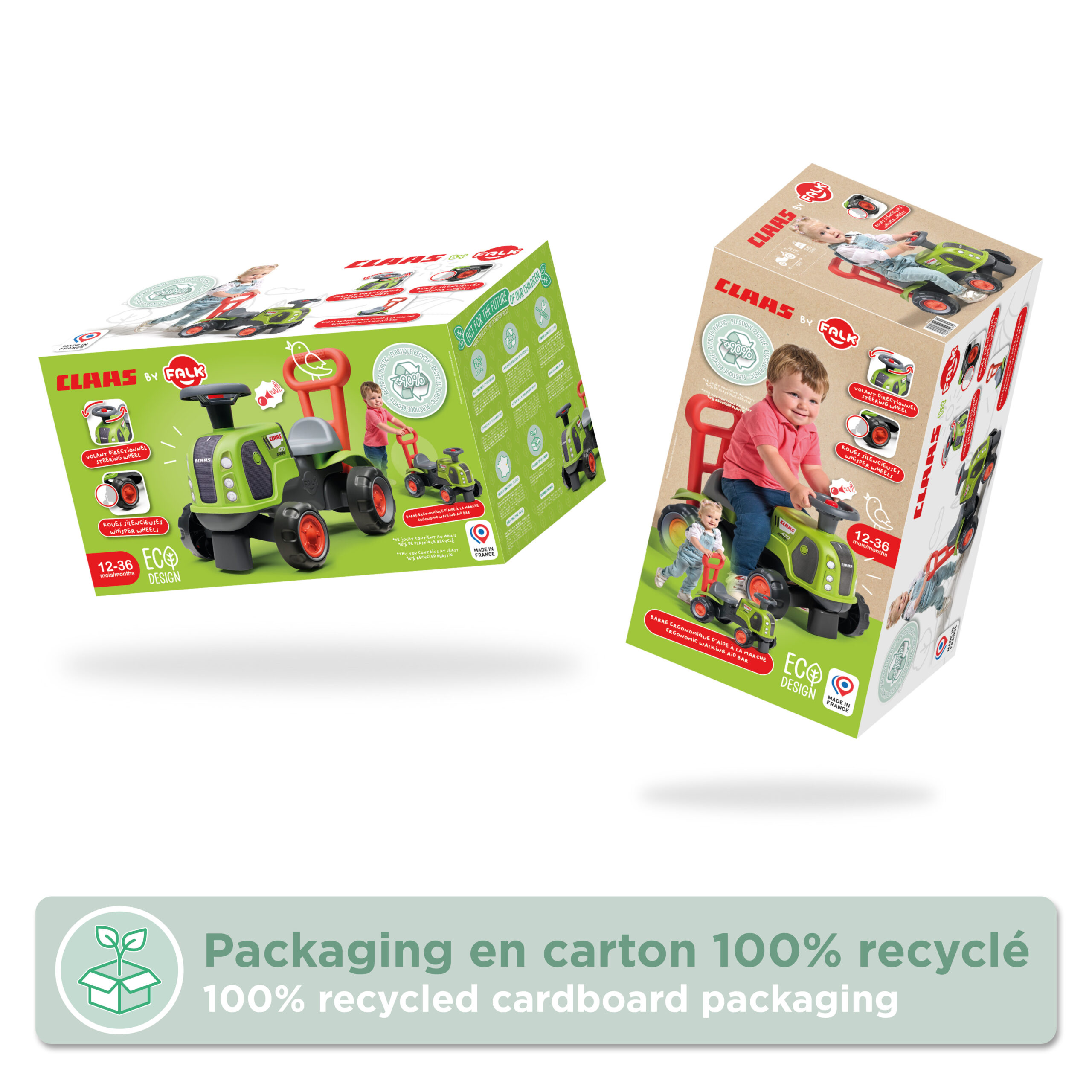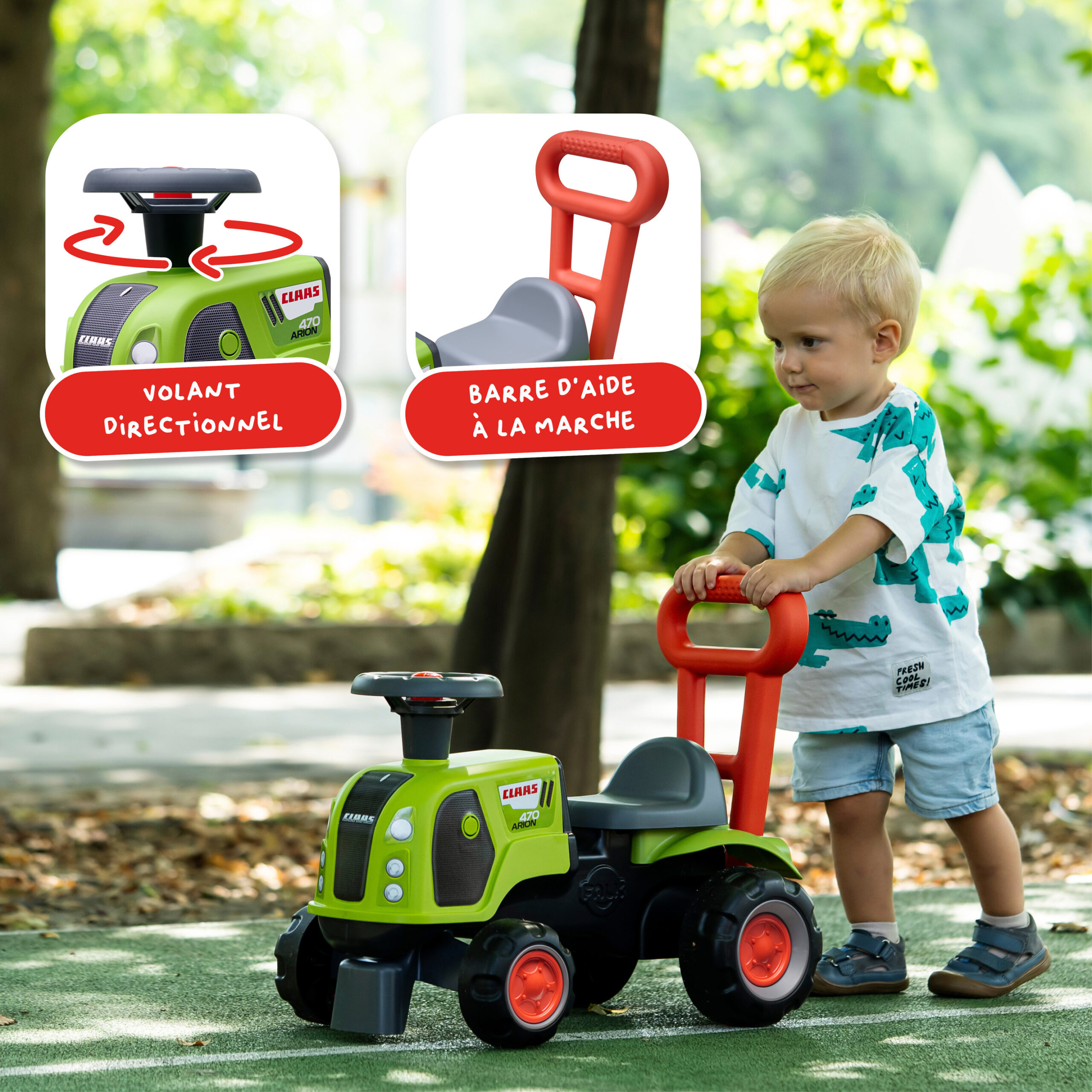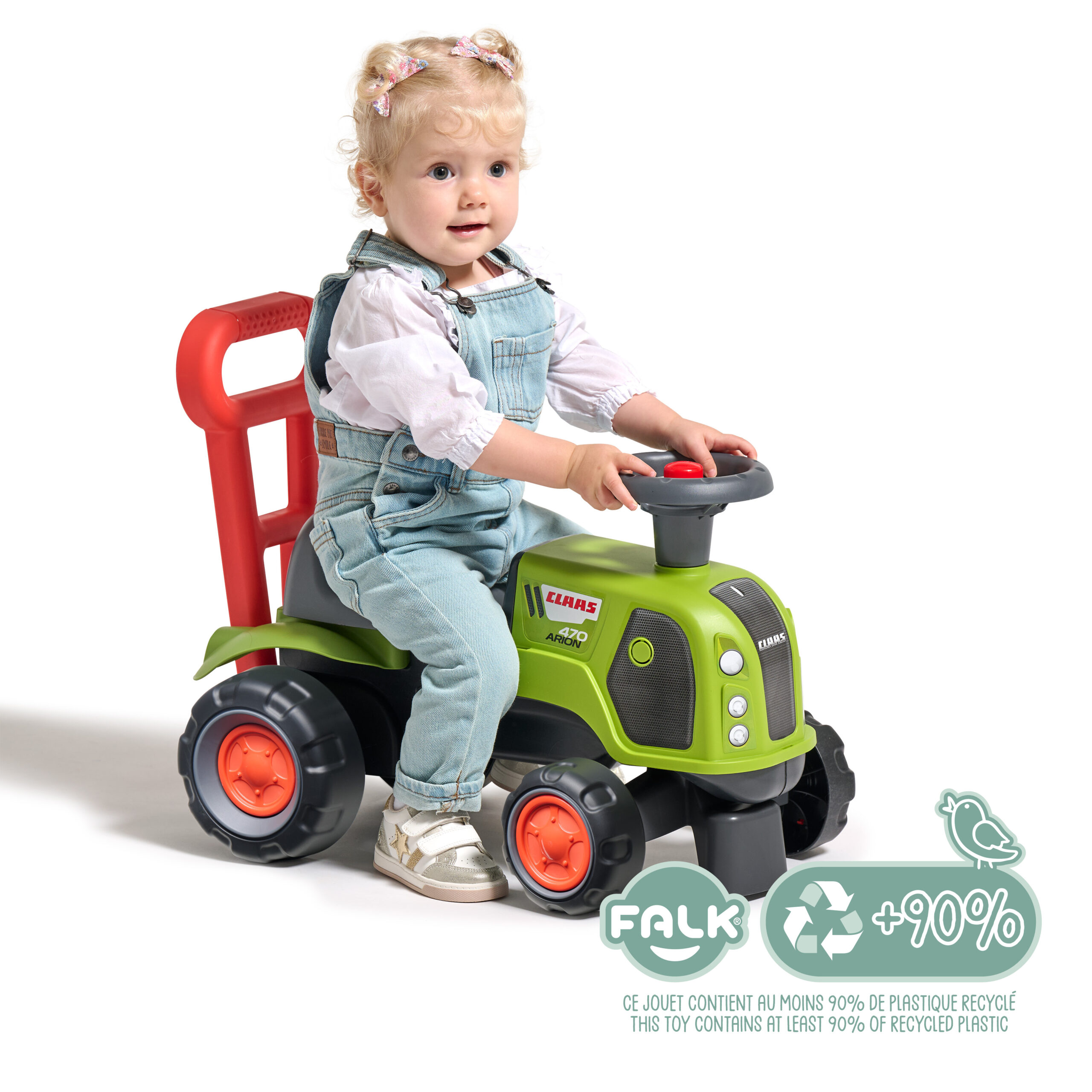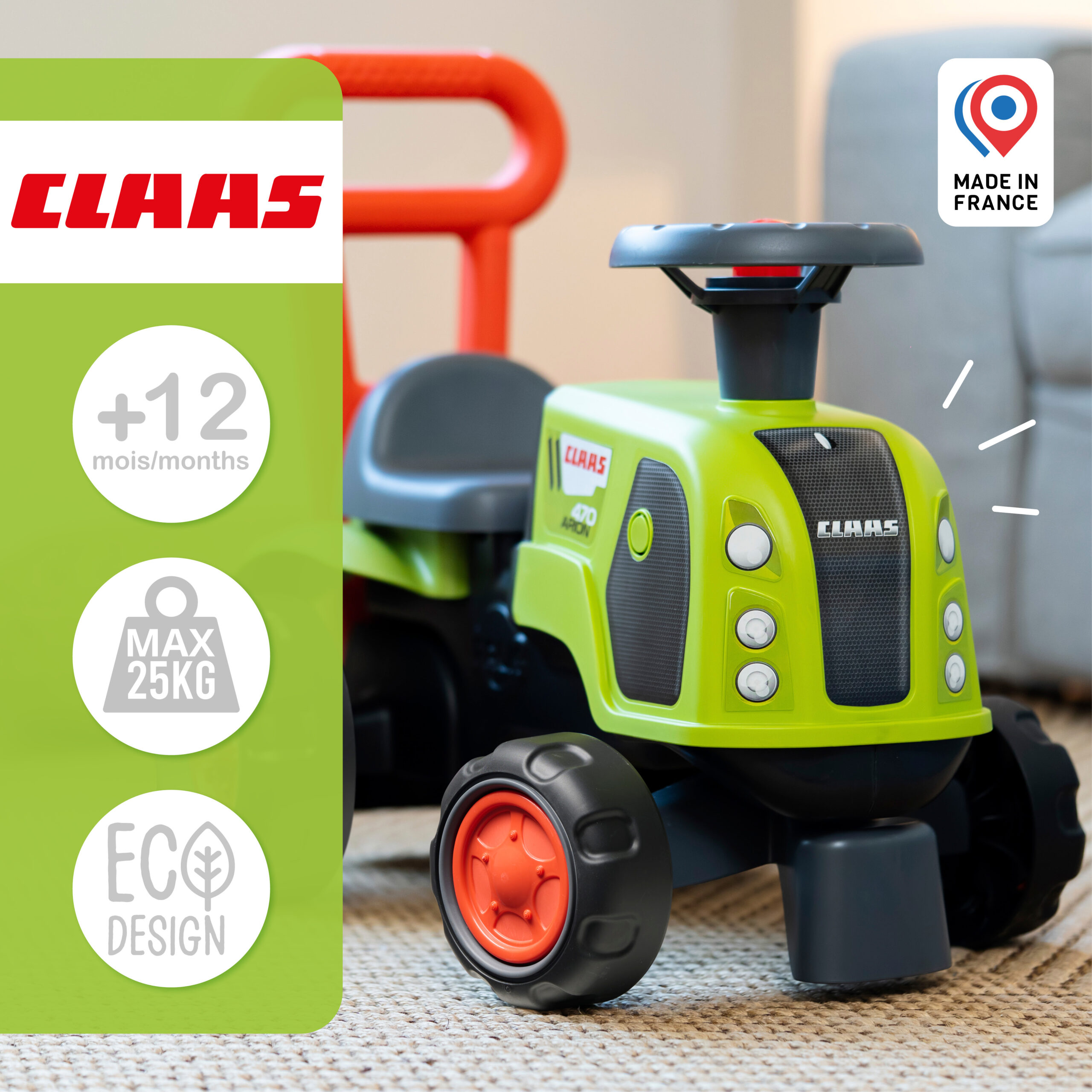 Porteur tracteur Claas 1er âge à volant directionnel avec klaxon, roues silencieuses et barre d’aide à la marche ergonomique – 100% Fabriqué en France – Composé d’au moins 90% de plastique recyclé – Dès 12 mois.
