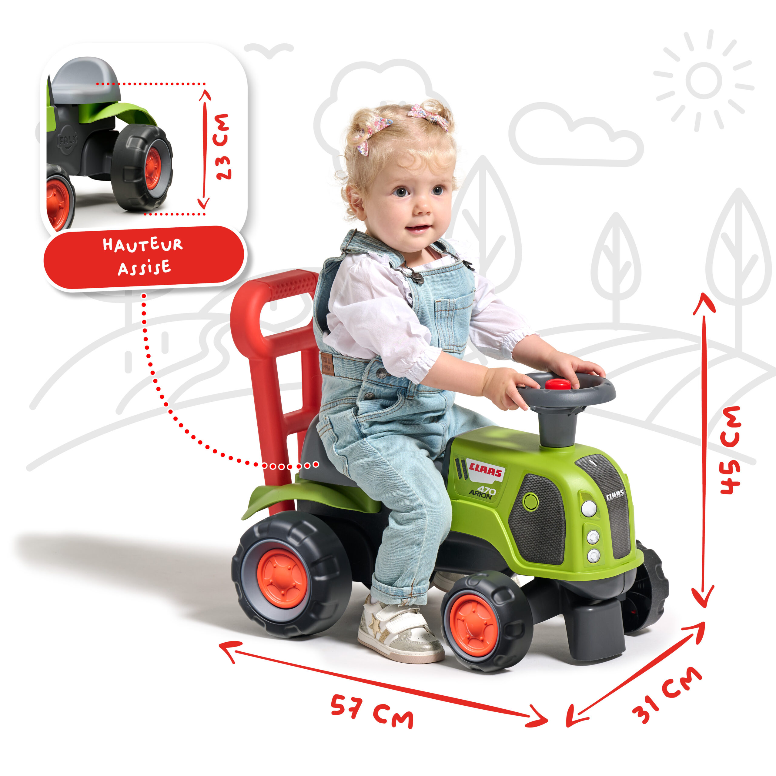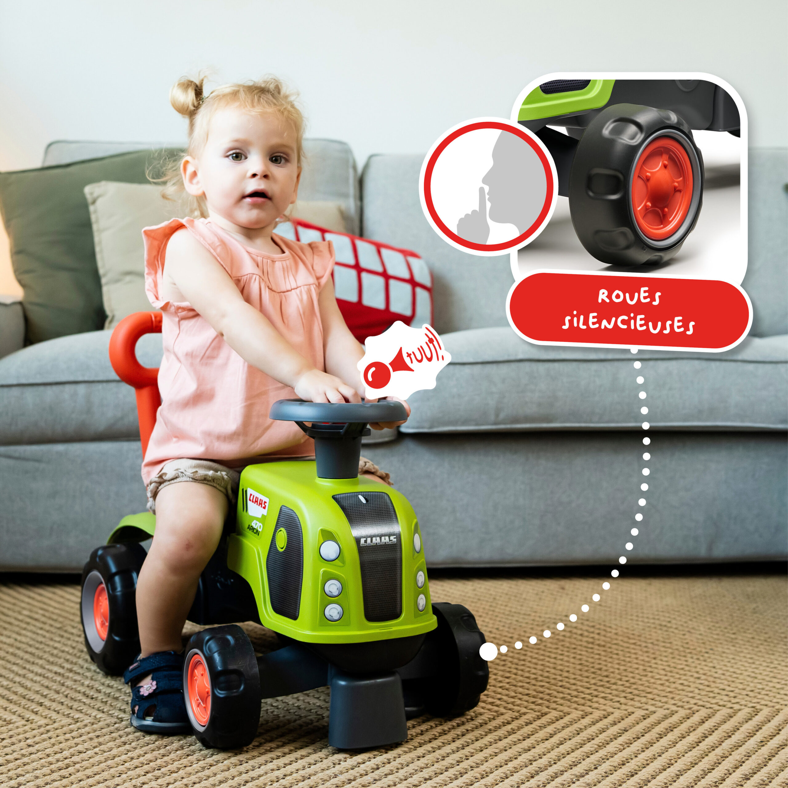Un petit tracteur Claas tout mignon et plein d’astuces qui accompagne votre enfant dès 12 mois jusqu’à ses premiers pas grâce à sa barre d’aide à la marche. Il est équipé d’un volant directionnel avec klaxon pour développer sa motricité fine et globale tout en s’amusant et sans faire de bruit grâce à ses roues recouverte d’une revêtement élastomère rendant l’utilisation de ce porteur parfaitement silencieuse tout en apportant une adhérence sécurisante.