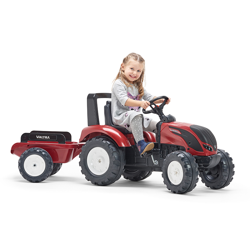 Tracteur Valtra, véritable réplique à pédales du modèle S4, équipé d’un arceau, d’un volant directionnel avec klaxon et d’une remorque à ridelles – 100% Fabriqué en France capable de résister aux petits jardiniers de 3 à 7 ans.